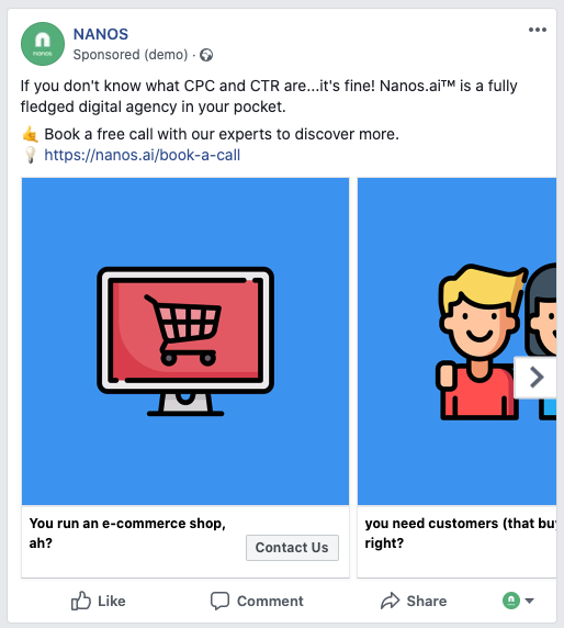 This first example is a carousel suitable for SAAS startups or digital services looking for customers. Our goal is to take the user to a landing page where it is possible to book a strategy call with one of our consultants.